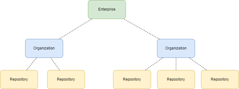 ก่อนอื่นต้องแนะนำก่อนว่า Enterprise เป็น Top-Level Account ใน GitHub ที่เพิ่มขึ้นมาใน GitHub Enterprise เท่านั้น โดย Enterprise Account นึงจะสามารถมีหลาย Organization อยู่ภายใน Enterprise ได้ ซึ่ง Organization นี้ก็จะเป็น Organization แบบเดียวกับใน GitHub Free และ GitHub Team แต่ว่า Enterprise Account จะมีเฉพาะใน GitHub Enterprise เท่านั้น